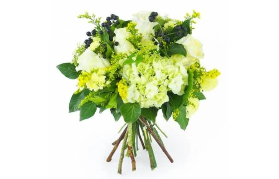 Détail du bouquet: Bouquet de fleur rond champêtre de couleur crème, jaune et vert réalisé avec de l’hortensia vert, des roses crèmes, du limonium jaune (ou toute autre fleurette jaune dans l’esprit), des fleurettes de couleurs blanches et vertes et des baies de couleur noire. Du feuillage, tel que du lierre, vient agrémenter l’ensemble. Réalisé par un artisan fleuriste local. (Fleurs variables selon les saisons et la disponibilité en magasin tout en gardant l’esprit, la forme et les couleurs). (Ref Florale : 1311 – Sofia). Visuel non contractuel – Visuel correspondant à la formule Meilleur Compromis.