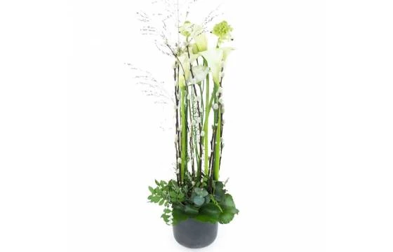 Détail de la composition: Assemblage de fleurs en hauteur de couleur blanche. Composé d’arum ou lys, oeillet ou rose, fleurettes blanches, graminée, chaton (ou autre branche bois) et feuillages diverses à la base. Le tout piqué dans un contenant en céramique rond foncé. (Fleurs et contenant céramique variables selon les saisons et la disponibilité en magasin tout en gardant l’esprit, la forme et les couleurs). (Ref Florale : 2312 – Lima). Visuel non contractuel – Visuel correspondant à la formule Meilleur Compromis.