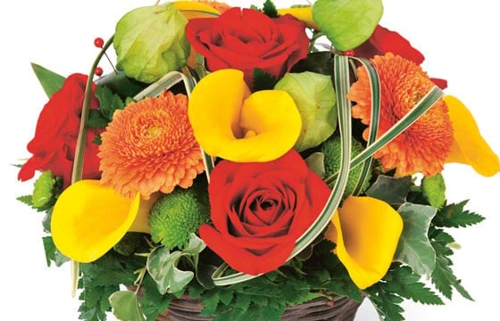 Détail des fleurs : roses rouge, callas jaune (ou tulipes jaunes), gerberas double orange, santinis vert, physalis, fougère et feuilles de pandanus. (Contenant et fleurs variables selon les saisons et la disponibilité en magasin tout en gardant l’esprit la forme et les couleurs.) (Réf. Florale 2230, Maïa.) – Visuel non contractuel – Visuel correspondant à la formule Meilleur Compromis.