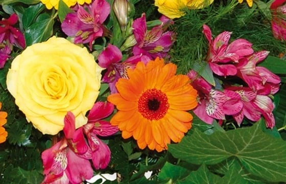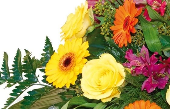 Détail de la composition de deuil : gerberas jaunes & orange, de roses jaunes & d’alstroemeria fuchsias ou rouges, lierre boule, fougère & des branches de lierre (Réf florale 9215 Univers) – Visuel non contractuel – Visuel correspondant à la formule Meilleur Compromis