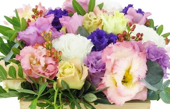 Détail de la composition: Assortiment de boutons de lisianthus dans les camaïeux de rose et feuillages dans un contenant bois carré. Le tout réalisé par un artisan fleuriste local. (Fleurs et contenant variables selon les saisons et la disponibilité en magasin tout en gardant l’esprit, la forme et les couleurs). (Ref Florale : 2323 – Quito). Visuel non contractuel – Visuel correspondant à la formule Meilleur Compromis.