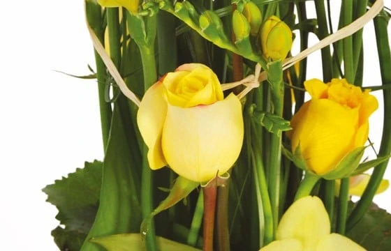 Détail du bouquet : un contenant jaune (zinc, céramique ou bois), freesias, roses, orchidee jaune, cerclage de beergrass, lien de raphia, feuillage de galax (Fleurs variables selon les saisons et la disponibilité en magasin tout en gardant l’esprit la forme et les couleurs)(Réf. Florale : 2249 – Bora-Bora). Visuel non contractuel – Visuel correspondant à la formule Meilleur Compromis.