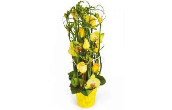 Découvrez et faites plaisir avec cette magnifique composition de fleurs jaunes toute en hauteur dans les tons jaune et vert du nom de Bora-Bora. En centre de table, pour un anniversaire ou tout simplement pour surprendre, cette création florale composée principalement de roses jaunes et d’orchidées aux pétales jaunes fera son effet à l’heureuse personne à la recevoir. Du freesia, des cerclages de beergrass et de feuille de galax viennent sublimer et harmoniser l’ensemble et apportent structure et équilibre à la composition.