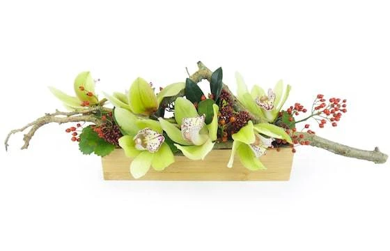 Détail de la composition: Composition de fleurs piquées dans les tons vert, rouge et blanc. Cette création florale réalisée par un artisan fleuriste local est composée d’orchidée ou cymbidium, baie, feuillage et décoration de bois naturel. Le tout piqué dans un contenant rectangulaire en bois. (Fleurs et contenant zinc ou céramique variables selon les saisons et la disponibilité en magasin tout en gardant l’esprit, la forme et les couleurs). (Ref Florale : 2303 – Détroit). Visuel non contractuel – Visuel correspondant à la formule Meilleur Compromis.