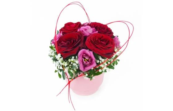 Détail de la composition : Beau et mignon assemblage de fleurs piquées dans les tons rose et rouge. Il est composé de rose rouge, lisianthus rose (ou rose fuchsia), gypsophile et diverses feuillages à la base. Un joli contenant en céramique rose (zinc ou bois selon disponibilité) sert de base avec une décoration en osier formant un coeur posé sur le dessus des fleurs. Fleurs, décoration et contenant variables selon les saisons et la disponibilité en magasin. En gardant l’esprit, la forme et les couleurs. (Réf Florale : 2334 – Ma Juliette). – Visuel non contractuel – Visuel correspondant à la formule Meilleur Compromis