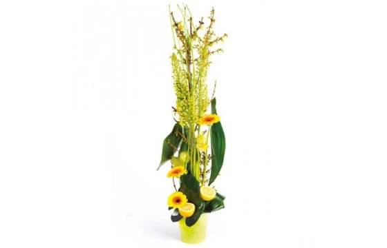 Envie de faire plaisir et envoyer une composition de fleurs à un proche ? Découvrez et commandez dès maintenant cette magnifique composition toute en hauteur du nom de Sunlight. Dans les tons vert et jaune, la composition florale Sunlight se compose d’une fleur très particulière et originale, l’heremurus aussi appelé le lys des steppes. Elle est la fleur principale et apporte toute la hauteur à cette création florale. Du gerbera aux pétales jaunes et du feuillage exotique et de cordyline viennent décorer et accompagner le lys de steppes. À la base de l’ensemble, qui est présenté dans un contenant en céramique de couleur vert tendre ou jaune, le fleuriste disposera des demi-citrons pour rajouter du détail et de l’éclat à la composition Sunlight.