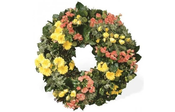 Vous recherchez une livraison de fleurs pour un deuil ? Rendre hommage à un être cher pour son enterrement, des obsèques avec une magnifique couronne de fleurs ? Découvrez et commandez-en ligne sur notre site internet cette magnifique couronne de fleurs de deuil dans les tons jaunes, rose et vert du nom de Témoignage Eternel. Une majestueuse création florale délicatement travaillée à plat avec du gerberas et de belles roses toutes les deux de couleur jaune. De mini œillets rose viennent sublimer l’ensemble accompagné par des fleurs de pittosporum et du feuillage apportant un équilibre visuel et de la verdure indispensable à toute couronne de deuil.