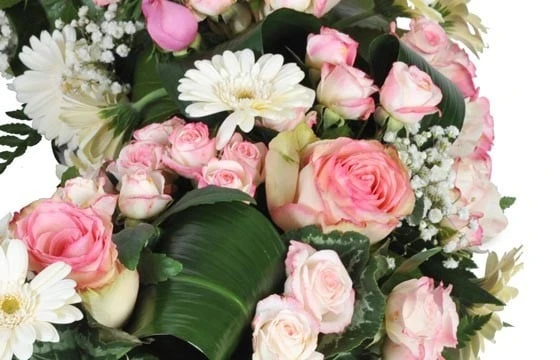 Détail de la couronne Infinie Tendresse : roses rose et parmes, gerberas blancs, gypsophile, feuillage de cordyline tourné, feuillage de fougère. Couronne de 70 cm de diamètre (Fleurs variables selon les saisons et la disponibilité en magasin tout en gardant l’esprit la forme et les couleurs)(Réf : 9243 – Infinie Tendresse) – Visuel non contractuel – Visuel correspondant à la formule Meilleur Compromis – Compatible pour les crémation