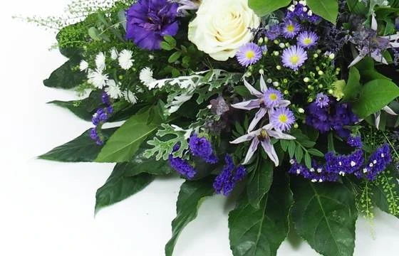 Détail de la gerbe de deuil : Coussin de deuil de fleurs piquées dans les tons blanc et violet-bleu. Cette création florale est composée de rose, lisianthus, clématite, camomille et autre fleurette champêtre. Un feuillage structuré est ajouté à la base mettant en valeur l’arrondi ainsi que du feuillage champêtre sur le restant de l’assemblage (Fleurs variables selon les saisons et la disponibilité en magasin tout en gardant l’esprit, la forme et les couleurs)(Ref Florale : 9312 – Neptune). Visuel non contractuel – Visuel correspondant à la formule Meilleur Compromis – Composition non compatible avec une crémation.