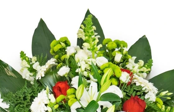 Cette gerbe de deuils est une balance de couleur avec du blanc marqué par du lys oriental, mais également du gerbera aux longues pétales ou encore du lisianthus, de petites fleurs ressemblant à des roses. Et du rouge, apporté par la reine des fleurs, des roses d’un rouge soutenu. Du feuillage de fougère et d’aspidistra donne du volume à l’ensemble et un noeud fait d’un épais ruban blanc et délicatement positionné à la base vient perfectionner la gerbe de fleurs. Pour votre achat de fleurs sur L’Agitateur Floral, nous nous engageons à reverser 0,50€ à une association caritative partenaire.
