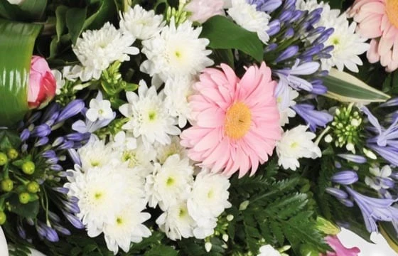 Détail des fleurs : pivoines rose (ou roses ou tête d’hortensia rose), gerberas rose, agapanthes bleues, refours blancs, lierre, cordylines, fougères et salal. (Fleurs variables selon les saisons et la disponibilité en magasin tout en gardant l’esprit la forme et les couleurs.) (Réf. florale 9236, L’Aurore.) – Visuel non contractuel – Visuel correspondant à la formule Meilleur Compromis.
